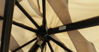 Danach montierten Sabine und ich den Schirm auf das Kreuz und füllten einen weiteren Sack Kies hinein. So hatte der Schirmständer bereits 105kg (also um 15kg mehr als mindestens gefordert). Fertig bringt der Ständer letztendlich etwa 110kg auf die Waage. Damit sollte er zumindest kleineren Windstößen gut standhalten können. Wenn der Wind ordentlich anschiebt bleibt ohnehin kein Auge trocken.